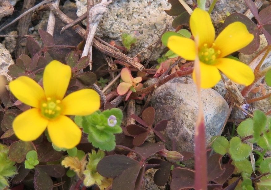 アカカタバミ・・・花色は黄、中心部が赤くなることが多い。 葉が赤っぽい。