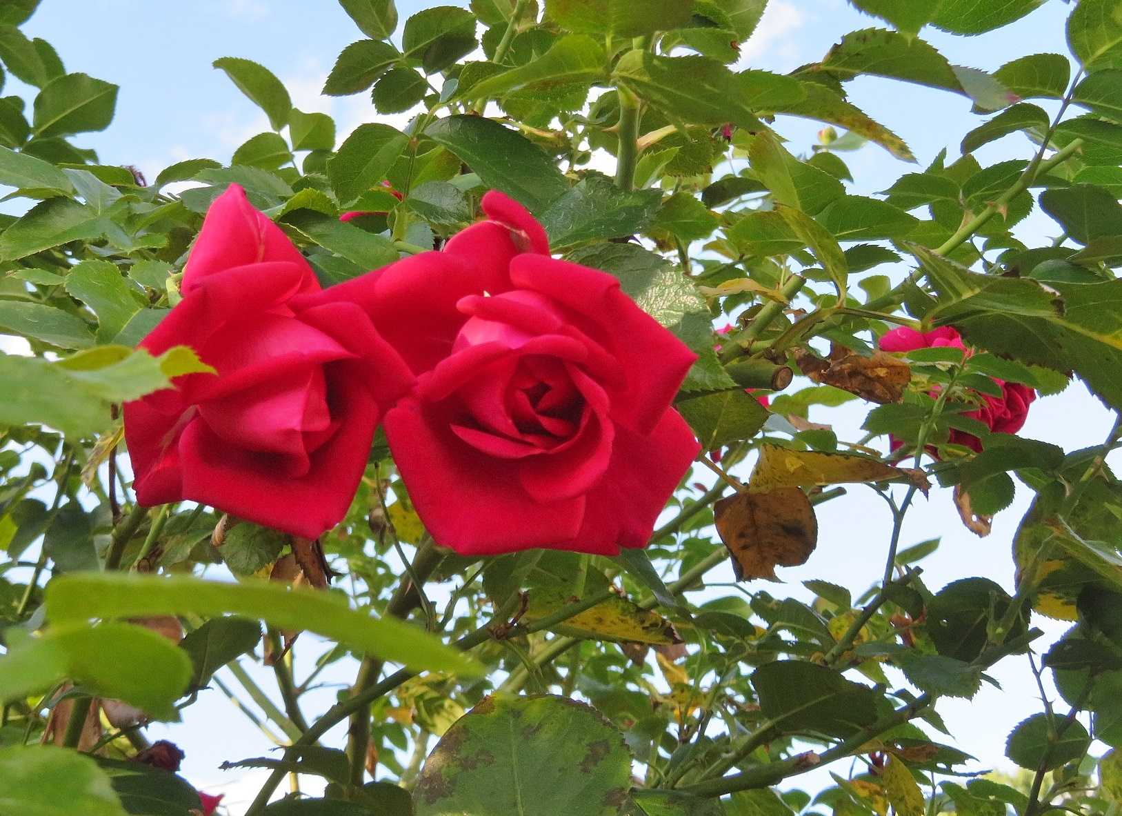 深みのあるクリムゾンレッドの中大輪ロゼット咲きの花が、健康的なダーク