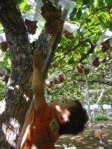 今日は家族3人、山梨までブドウ狩りに行ってきました!!実家に泊まった時のように、ohtaもさぞかし喜んでくれるだろう~と思いながら・・。車の中で寝ていたohtaは寝起きながらも、到着後早速試食のブドウを食べてたよ(*^。^*)ohtaがいるので時間無制限の食べ放題のとこを選んで行ったのだけど。そこまで行くまでの間も周りは全部ブドウ園ばかり・・。海の家張りに呼び込みしてたのにはびっくりした。ブドウの木は思ってたより背が低くてパパはohtaを抱っこしながら腰をかがませて・・ご苦労様!!ohtaも自分で手を伸ばしてブドウを取ろうと必死!!←この時はおとなしく食べてたけど・・ohtaはブドウを食べることよりも、ブドウ園の中を自由に走り回ることのほうがいいみたいで、うちらが食べてる間ずーっと動き回ってた。もう服なんて土だらけ(-_-;)まるでブドウ園の子!?のように、おじさんについてまわり、新しく来たお客さんに説明してる間もそばにずっといるし(笑)←最後にみんなで撮ってもらったよ!ohtaはあまりにも汚かったので着替えさせた・・。私たちもohtaにあちこち触られ泥だらけ・・着替えもってくれば良かった!?最初に盛りだくさんブドウを取ってしまった私たち・・。結局食べきれずに買い取りしてきました。いっぺんに取らなければ良かった・・反省・・。お昼食べてから、近くの「フルーツ公園」に遊びに行った。ここは夜景がとっても綺麗で新!日本の夜景3景に選ばれてるらしい☆確かに上までバスで上ったところすばらしい風景だったよ☆ohtaはそこにあった乗り物を見つけると一目散に駆け出して乗り込んでた。お花も綺麗だし、水のなかにアスレチックがあったりここはかなりお勧めです!!今日は夜景までいれなかったけど、今度はぜひ夜景みたいな~☆パパ運転お疲れ様でした!!