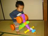 あー今日も寒い!!冬生まれの私なのに・・寒いのはかなり苦手。洗濯干すのでさえ、「さむい・・さむい・・・」とつぶやきながら。ohtaはそんな私になんてお構いなしで今日も朝から元気いっぱい!!洗濯を干してる間も一緒になってベランダに出てた。見るとまた洗濯バサミを下に落としてるし・・。全部片付けてしまうと、今度は周辺を物色しだした。「何か落とすのないかなぁ・・」って。そしてohtaの目に留まったもの!それは植木鉢(゜o゜)植木鉢と言っても本当にミニサイズでプラスティク素材。それにもちろん柵の間を通るはずもなく。ohtaは何度か試してみるものの無理なことに気づき、すぐにポーンと投げ捨ててた・・。ふぅ・・私にそっくりなあきらめの早さだわ(-_-;)部屋で一人で遊ぶohta☆ミニカーを出してはなぜか投げる!投げる!!たまに当たって痛い・・。投げる度に注意はするんだけど聞きやしない。今日も午後から友達宅へお邪魔した♪みんなより少し遅れて行ったところ玄関を開けたとたん無数の子供たちが流れ込んできた~・・。ここは託児所??すごいことになってたさ。まぁohtaもすぐに加わってたけどね。ohtaはここではミニカーで普通に遊んでたのでほっとした。でもローテーブルの上から何度も何度もジャンプしてたな・・。全然昼寝をしないでいたので帰ってすぐに寝てしまったohta。でも今日こそはお風呂にいれなくては!と思ってたので熟睡中のohtaを起こして入れた。もちろん大泣き(>_