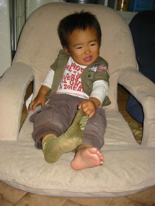 最近のohtaはだいぶこちらの言うことが分かってきて、会話!?っぽくなってきました。問いかけなんかにもちゃんと答えるし。でもまぁほとんどちんぷんかんぷんなこと言ってるんだけどね(*^_^*)「ビデオ見る?」と言うと「び!び!!」とデッキを指して要求!!「ちゃんとえんちょしてね」と言うと素早く座椅子に座って始まるのを待つohta。その姿はかなりおりこうさん☆ミ朝の時間は7時10分~9時までの時間ほとんどテレビに首ったけ。今日も天気が良かったので公園へ遊びに出た。家を出る前にohtaは帽子を見つけ、「これ被る!!」と言うように帽子を渡してきた。被せてあげると・・・小さい・・。「ohta~帽子浮いてるんですけど・・」と言っても本人まったく気づくはずもなく得意げに外へ飛び出した。今日は友達にメールをしといたので久々に大勢で遊んだよ(^^♪一人が走り出すとみんなで追いかけ、一人が公園を脱走するとまたみんなで追いかけ。ohtaの帽子の小ささを指摘された私は遊ぶのにも邪魔かなぁと、帽子を取ってあげたら途端にすごい剣幕で怒り出したので慌ててまた被せましたよ・・。滑り台で遊ぶohta。以前滑り台を駆け下りたことがあったけど、最近ではそんなこともなくちゃんと滑ってる。ただ後ろスーパーマンの格好でね。いつになったらここの滑り台で座って滑れるようになるのかな??ひとしきり遊んだohtaはうちに帰ると、早速自分で靴下を脱ぎ始めたのだけどなかなかうまく脱げずに・・。こんな感じに↓靴下はかせると決まって脱いでしまうのだよねぇ。困ったもんだ。午後からマオママが歯医者さんに行くと言うのでその間、マオちゃんを見ててあげることに。プレイルームが併設されてるのでそこでohtaと遊んでた♪その前に近くの公園で少し遊んでたのだけど、雨が降ったため水たまりがあちこちにできてて危険だなぁ・・と思ってたら。やってくれました。自ら泥水たまりに近づいて足でばしゃばしゃ(゜o゜)いやぁ!!ありえない~!!!その後急に雨が降り出ししてきたので戻ろうとしたところ今度は両手でおもいっきし水たまりを叩き。。。ドロドログチャグチャに。はぁぁぁぁぁ・・。鼻水たらしてるのぃ。。すごく楽しそうだったけど、急いで抱えて走りました。子供はどうして水たまり好きなんでしょうね??勘弁してください。。