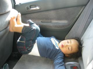 今日は暖かかったなぁ。。。日向ぼっこ日和のいい天気☆ohtaを連れて実家へと行ってきた。昨日の傷は本人はまったく気にしてない。「痛くない?」と聞いてもぽけーっとしてるだけで反応なし。見てるこっちのほうが痛くなっちゃう。まぁ、そんな感じですから今日もじっとなんてしてるわけなく。。実家の前で遊んでたのだけど。車のタイヤ止めの上からジャンプしたり、前のアパートの階段を登ったりと止まることなく動いてた(-_-;)車の中でも自由なohta↓ちなみにこれはパーキング内で停まってるときです。今日は父親も弟も休みで、みんな一緒に行動した。家族ででかけることなんていつぶり?ってくらい久しぶり。なんか懐かしい感じ。いつも行く横須賀のスーパーへ買い物に行ったのだけど、パートの人に「二人目?」とおなかを触られた。前に来たときもほかのパートさんにおなじことされたんだけど、いないし!!ん!?いないのに聞かれるってことはお腹がやばい!ってこと!?軽く・・いやかなりショック(ーー;)ohtaはじいじが見ててくれたので母親と二人で買い物に集中できたよ。楽だった♪今日は父親にも昨日作ったガトーショコラを持って行ったのだけどohtaがこれを見つけて、食べたい!と言うので切ってもらうことに。お皿に載せてあるのをフォークで一刺ししてがぶり!と食べてたohta(笑)豪快だった。「美味しい?」と聞くと口の中をもぐもぐさせながら何か言ってた(^^♪途中自分でティッシュを取って口を拭いてたのが笑えた。何も言ってないのにね。しかもそのティッシュを箱に戻したからね(笑)最近ohtaとの会話がすごく楽しい♪オウムのように繰り返す。言えてる言葉もあるけど難しいと適当に言ってるなぁってわかる感じがまた笑える。しかもohta言葉の後ろに絶対疑問符がついてるんだもん。しり上がりなんだよねぇ。なんでだろう。自信のなさの現われかしら?テレビで「大岡越前」の風景が映ったとき(芸能ニュース内で)急に「オ~レ~オ~レ~!!」とマツケンサンバを踊りだしたohta!着物とちょんまげで同一人物と思ったか!!惜しい!残念!!