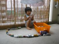 最近のohtaは家にいる時はほとんどミニカー遊びに励んでます(笑)朝起きると寝ぼけながらも「ぶーぶーであそぶぅ・・」と言いながら遊びだす始末。もちろん保育園でも同じように遊んでます本当に男の子ってなんでこんなにミニカーが好きなんでしょうね。私を遊びに誘う言葉も微妙に変化してきた。今までは「ママあそぼ~」と言って手を引っ張っていかれてたんだけど最近は「ママ、手つなごぉよぉ~!いこぉ!あっちでいっしょあそぼ!」などと言うようになったし。ミニカーの渋滞もかなりレベルアップカーブしてるからね(笑)保育園ノート今日はホールで滑り台やマットのお山、プラスティックカーで遊びました。マットの上で大胆にジャンプするおうちゃん!!「せんせ~もすわって!!」と滑り台に誘ってくれました。来月に保育園で行う納涼会のために最近、保育園ではお兄ちゃんなんかと一緒に踊りの練習をしてるそう。ohtaはお兄ちゃんたちがいると緊張するのか、いつもよりおとなしいみたい。(笑)