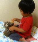 今日はみんなで私の実家に遊びに行った。保育園に行くようになってから前ほど頻繁に行くことがなくなったなぁ。実家に行く前にマックに寄ってお昼を調達!ohtaには今日はちゃんとハッピーセットを買ってあげた♪もちろんお目当ては「カーズ」のおもちゃ。だけど欲しかった(私がね!)主役のおもちゃはすでに品切れ・・。仕方なく二番のおもちゃにしたよ。実家でohtaに渡してあげたらすごい喜んでくれた。思ったより大きくてしっかりしてたよ。実家の近くにあるおばあちゃん宅にも今日は顔を出した。ohtaは猫がいるのでこの場所が好きみたいでも猫とは一定の距離を保ってたのがおかしかったよ(笑)従兄弟のおばさん(母親のお姉さん)がohtaにぬいぐるみをくれた♪これ、すごいよね?手作りなんだって。地元のフリマでひとつ¥200で売ってたらしい。安いなぁ。実家に帰ってからも昼寝もしないで、ソファの上を飛んだり跳ねたりして遊んでた。相手をするほうが疲れちゃうわ。ようやく寝てくれたのはもう6時過ぎ。それでもじいじが帰ってごはんを食べる時には起きて、みんなで頂きました!!ohtaは自分専用の椅子に座ってご満悦!「まえ~!まえ~!!」とテーブルとの間に隙間があると前へ移動させろ!と指示するし・・。相変わらず、私の弟は駄目みたいで、「こわい~!」とおびえてたよ(笑)調子がいいと大丈夫みたいだけどほぼ駄目だね。何したんだかなぁ??