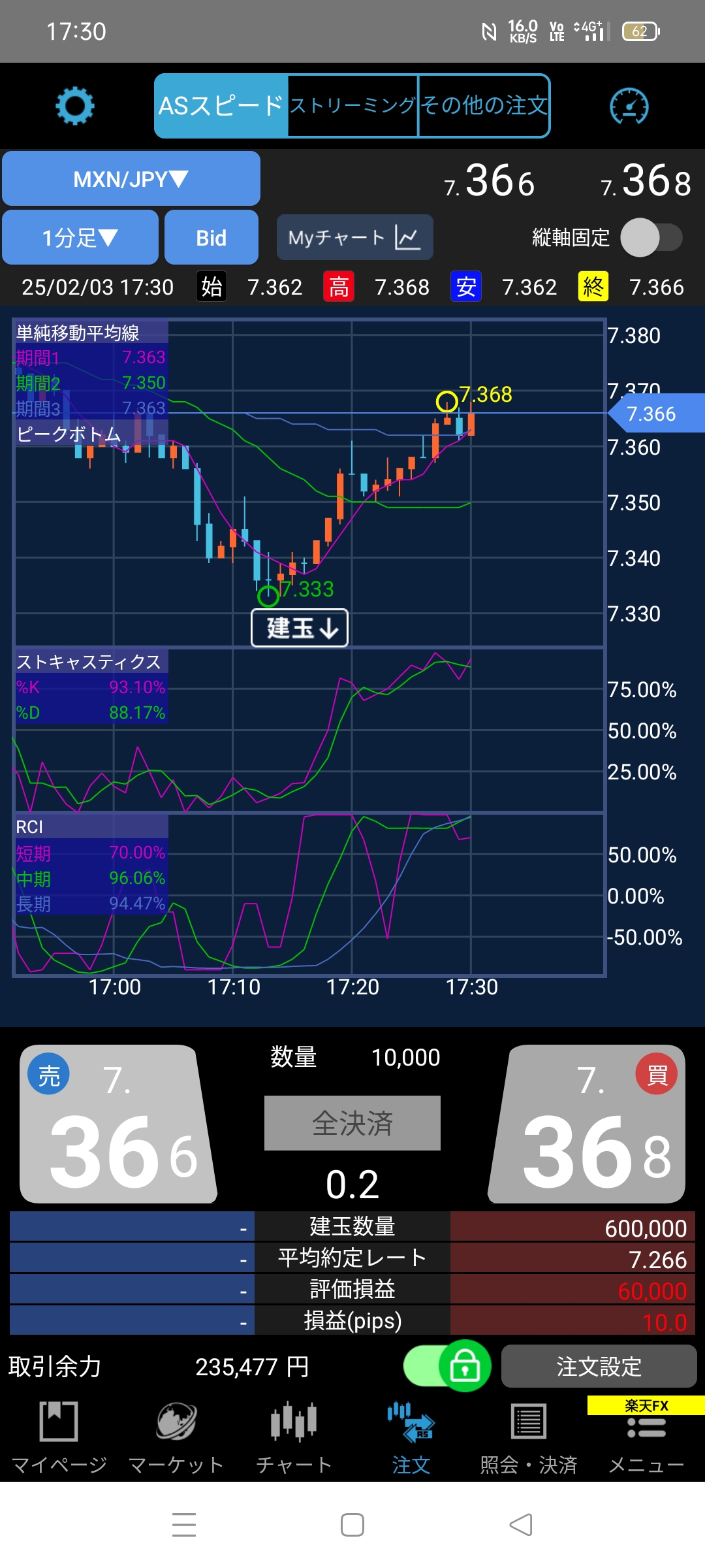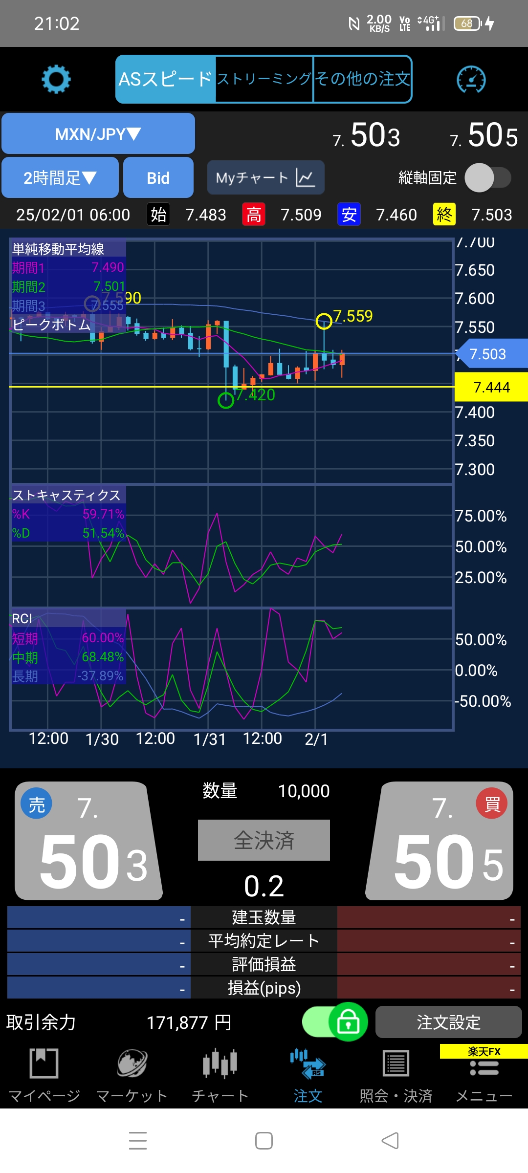 ペソ200ロットで半年間買いポジションで約6万円儲ける予定でしたが1ヶ月て目標達成してしまったぽ♪約7万円だぽ♪2月の買い方は高くても7.432以上は買わないぽ♪勢いが早く下がっていたら7.432を下げる予定ぽ♪月曜はチャートずーッと見ていられないからリブオーダーしとくぽ♪取引余力は売り買いの3分の2は入れときたいぽ♪つまり予算の3分の1で運用だぽ♪ペソは400ロットまで手を出せますぽ♪約12万円ぽ♪