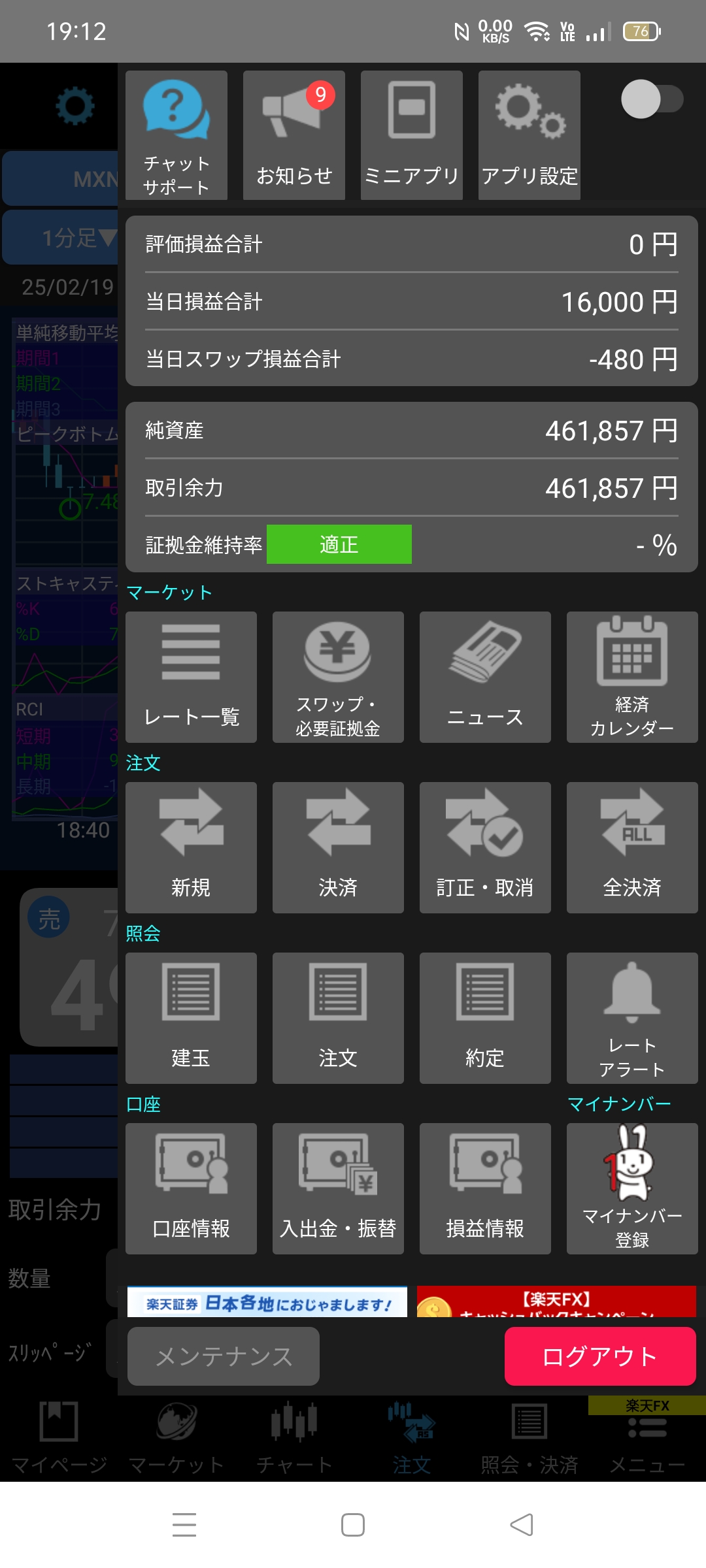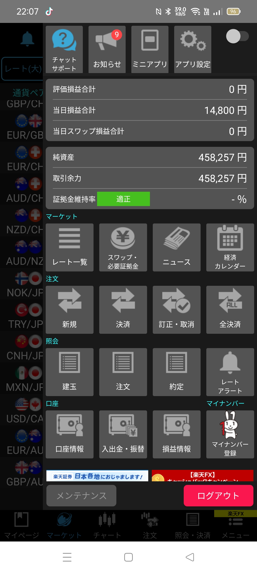 スキャルピングの数分取引で勝利でふお♪今日は660円増えただけで満足して終了しましたお♪って思っていたら3枚目の画像を見たら辻褄が合わないお!?総理大臣が確定では ないけれど?決まって3円の円高だお♪スキャルピング取引のはずが水曜から木曜日にかけて売りで保有し続けてしまいマイナスのスワップポイントだお!?マイナスの表示は次の画像で見てお♪次の日に10時間位かけて取り戻したお♪FXの損切りは基本取引余力がカギなのでふお♪使わないお金が沢山あれば安泰だお♪10ロット取引している場合 取引余力が10ロット分入れておきたいお♪詳しく知らないけれど5〜6円マイナスでもロスカットされないと踏んでいまふお♪昨日みたいな数分で3円動いたら取引余力なしだとロスカットされちゃうかもだお♪