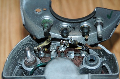 バッテリーチェックランプが点灯していたマルニ。発電機を降ろしてみると・・・。ダイオードへ向かう配線が振動で切れていました。丁度にしやんさんのブログでもオルタネーターの記事があったので比較してみると・・・。固定ネジが片方無いのはやはり異常だったんですね。以前バラした時、不思議に思ってたのですが・・。真ん中のダイオードの端子が折れてハンダ付け不可能になったのでアジトに電車で行って部品取り車からオルタネーターを譲ってもらい持ち帰って修理しました。部品取りの発電機を点検するとあまり内部の状態は良くなかったので(全体的にサビがひどいのとベアリングにガタが・・。)ダイオード板とダイオード板取り付け用絶縁体を移植してニコイチにして組み上げてクルマに組みました。ここで異常事態発生!バッテリーを繋ぐと「L」の赤ランプが点灯します。キーをひねってイグニッション・オン、アクセサリーにすると通常の状態に戻るのですが・・・。