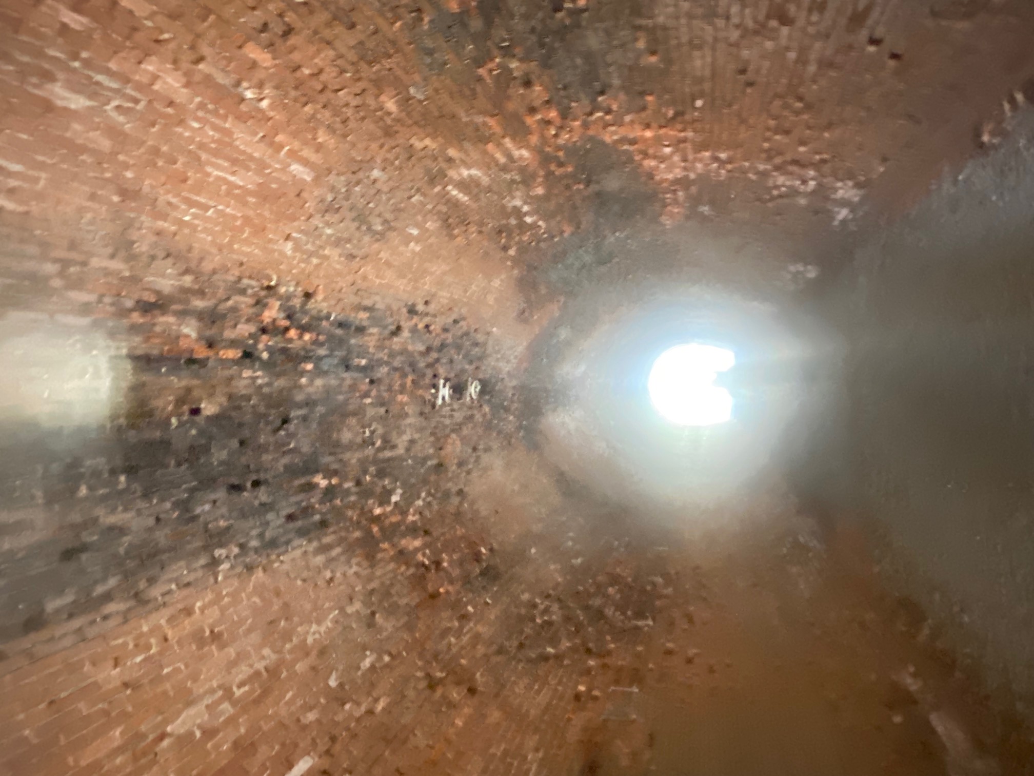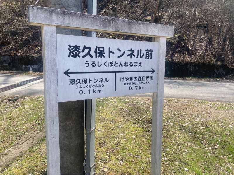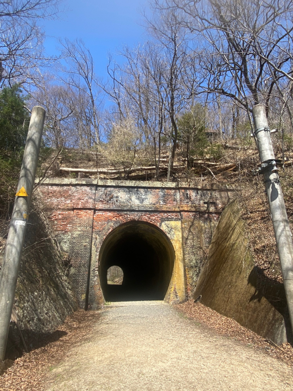 漆久保トンネル内部:全長53m。明科で焼成されたレンガを使用しています。壁に付いている黒い煤は、蒸気機関車時代の煤煙の痕跡です。
