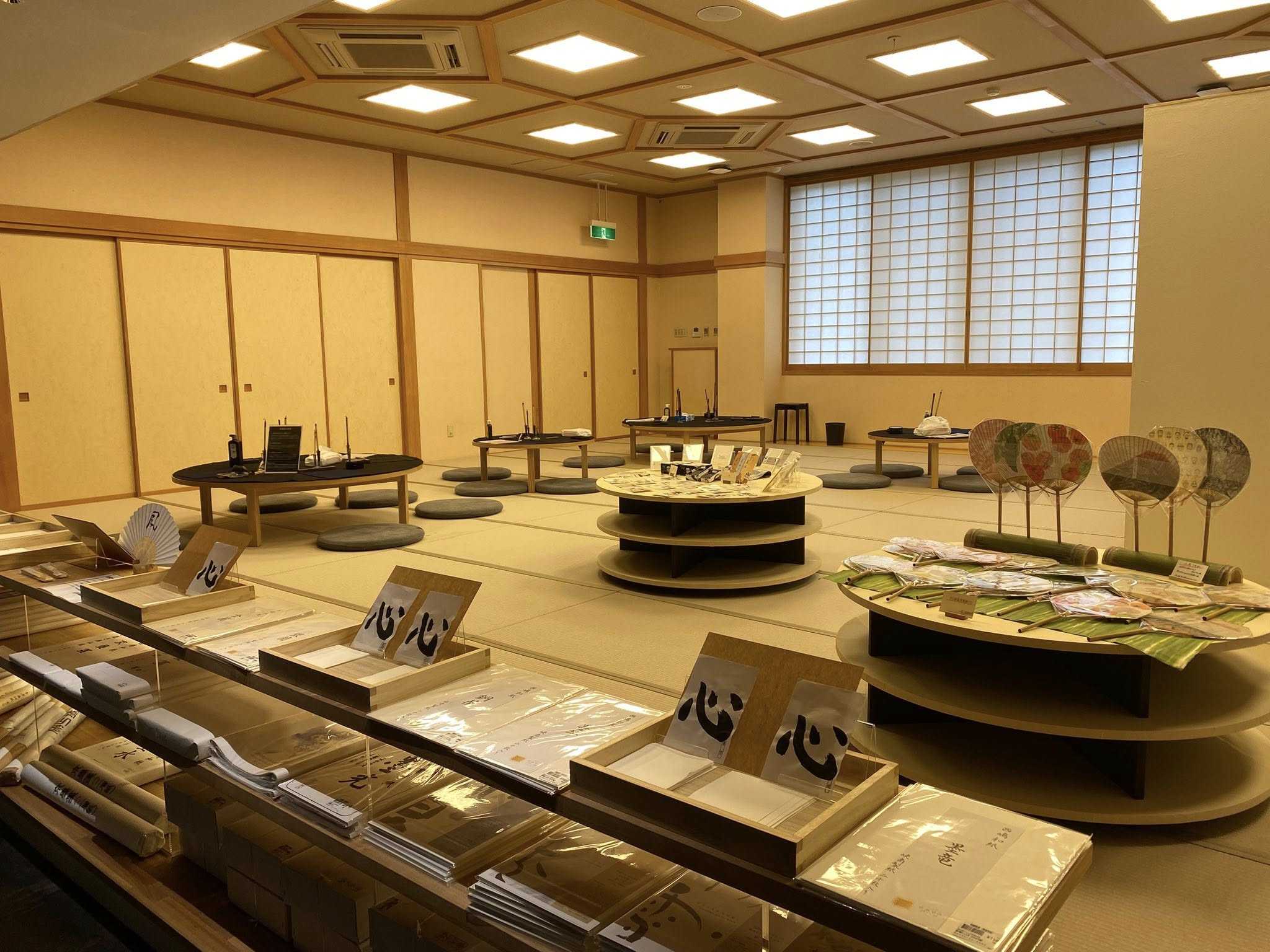 かみすき館・書道体験コーナー:数種類の西嶋和紙に、実際に筆で試し書きができるコーナーです。
