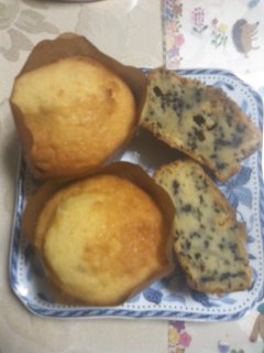 いただきもののお芋を使ってちゃちゃっと おやつを作りました。娘が「何を作ろうかな?」と言っている間に私は、バウンドケーキをつくりました。お芋と相性のいい黒ゴマをたっぷり入れて。その代り、お砂糖は ごくごく控え目に。焼きあがったら、今度は娘が、これも彼女の十八番のマフィンを焼きました。何を作ろうかな?と、私はパソコン、娘は本であれこれ調べてはみたものの、結局は二人とも、いつもの十八番に決まりです。さて、試食タイム!!!おいし~い♪どっちのが?くやしいけれど、やっぱり娘のがお砂糖とバターたっぷりで、おいしかったです。私のは、朝食にいいかな?昨日も今日も、雨が落ちそうなどんよりとした曇り空です。でも今日は、たくさんの洗濯と、台所と居間のかたづけをしました。これから、いつものお店よりちょっと遠くまで足を延ばして買い物に行ってきます。目指すは、整理かご。息子の部屋のちらかったものをとりあえず、入れてもらおうと思って・・・・。小さい頃は、あんな片づけべたじゃなかったのに・・・。(人のことは言えませんが・・・・(^^ゞ )