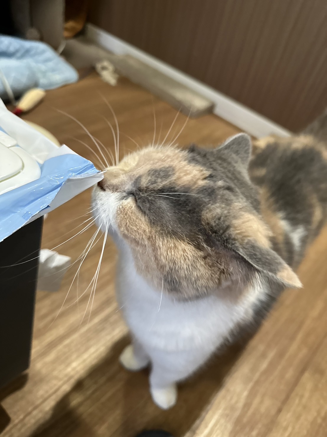 ウエットティッシュに顔を擦り付けているのも可愛いです![]()