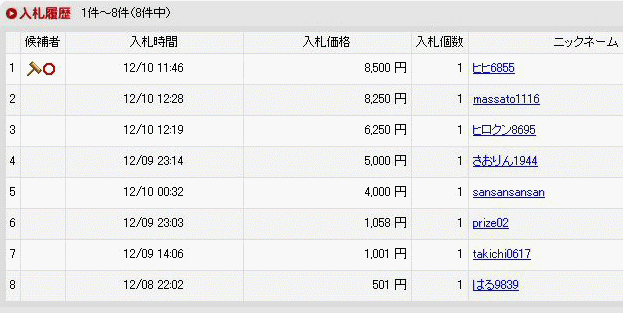 体調不十分ですが、とりあえず復活です。(笑)そんなこんなで、余計なお世話ですが、明日は入札だけで3ポイントオークション(11/23~12/07日終了分)入札だけで3ポイントオークション(11/28~12/07日終了分)の入札締め切り日です。入札だけで3ポイントオークション(11/23~12/07日終了分)の方は、明日の午前10ころから順次締め切りとなります。入札だけで3ポイントオークション(11/28~12/07日終了分)の方は、明日の午後2ころから順次締め切りとなります。まあ、今日中に入札を完了させておいたほうが面倒がないでしょう。現時点(12/06 13時頃)の入札状況ですが、全ての商品で出品数を超えております。もう、1円入札で落札になることはないはずです。いちばん入札件数が少ない「乱切りマグロのネギトロ用たたき」でも6,907件の入札があります。心配していた、ボタンエビも結局は8,592件の入札になってますね。(笑)※入札は、どこまでも、自己責任でお願いいたします。