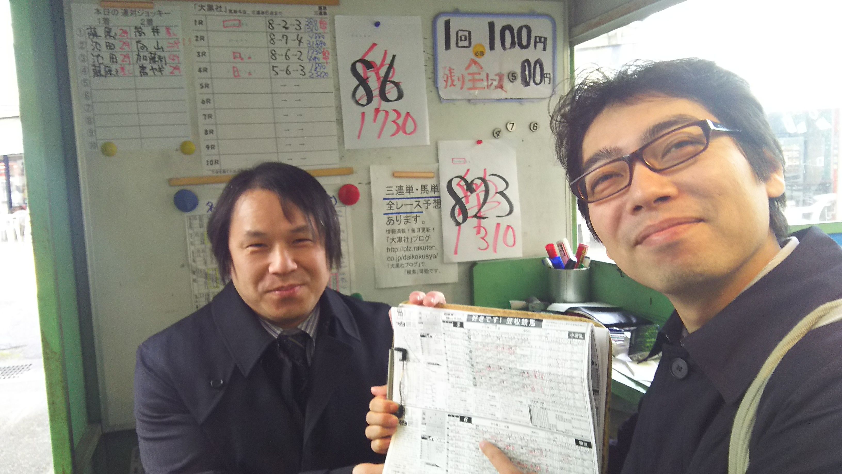 ★筒井勇介ジョッキー、第7レースの「カスミポップコーン」で通算800勝を達成しました!ほとんどの愛馬への騎乗を任されている吉田勝利オーナーのお馬さんで、決めたのも良かったですね。まあ吉田オーナーにすれば、朝イチや第6レースの愛馬でも、筒井ジョッキーには勝って欲しかったというのが本音でしょうか。『勇介に開催リーディングを獲らせたい!』って言ってましたから。思えば、吉田オーナーの「アラビアンマジック」(3番人気)が小倉に出走した時『勇介にJRA初勝利を!』と、JRAの愛馬に起用したことを思い出します。(2011年のクリスマスイブ)その時、自分も気合いを入れて単複の馬券を買ったのですが、見せ場はあったものの4着でした。もう筒井ファンも待てないよ。JRAの初勝利も、笠松リーディング争いも。さらに上を目指して欲しいところです。新旧の筒井さんの写真などは次回のブログに。★今日の第8レース、1番人気「ヴィストーソ」の佐藤友則ジョッキーと、勝てば300勝だった加藤誓二ジョッキー騎乗の「エイシンランチャー」のマッチレースも、見応えありました。あのタイムで負ければ、誓二ジョッキーも悔いなしでしょうが、ファンの方は来週の名古屋に熱視線を送ることでしょう。★おなじみ原田篤史オーナー(右・ヘン顔の方)が、川崎賢二オーナーを紹介してくれました。本日は岐阜県馬主会の理事会があるそうで、原田オーナーが理事なのは一部で知られてますが、川崎オーナーは監事としてご活躍されております。その川崎オーナーの愛馬「メディタレーニアン」が第6レースで圧勝劇!そういや、昨日(水曜)の最終レースの「ライスエッグ」(2着)も川崎さんの愛馬でした。このレース、自分の軸馬が「キングスクルーザー」(3着)で、「ライスエッグ」も買ってましたが、まさか「スリーネルソン」が圏外に去るとは思っていなかったので参りました。ということで、実りある理事会であったことを願うばかりです。春は近い笠松けいば!★笠松けいば『梅花シリーズ』は金曜が最終日です。「大黒社ネット予想」は、ここをクリック。