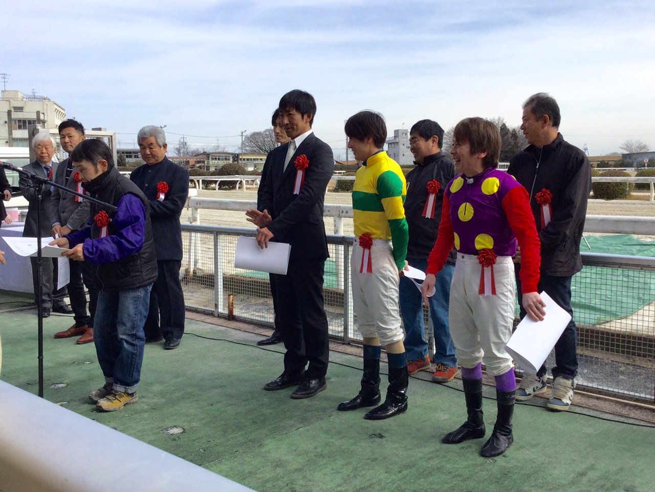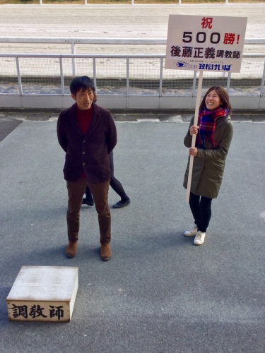 ★下の写真は、本日の『後藤正義調教師地方競馬通算500勝達成セレモニー』より。詳細は、写真を提供してくれた黒ゆりさんのブログをご覧ください。★水曜の個人的な見どころを少し。朝イチ「クマリ」の鞍上は、名古屋の加藤聡一ジョッキーに。ついに笠松リーディング厩舎からも、お声がかかったのか。久々の平場なら脈あり!?第5レースには転入初戦となる「マズルファイヤー」が登場。もう4年前になりますが、『きさらぎ賞』で2着に入線、「ロゴタイプ」が勝った『皐月賞』でも7着という戦歴。確かに笠松のB級に編入なら、負けられないところですが、転入馬の中にも稀に、とんだ一杯食わせ者もおります。1番人気必至で馬券的な妙味に欠ける存在だけに、取捨選択にはご注意を。第9レースのJRA交流『梅見月賞』は、JRAから5頭出走も全て地方ジョッキーが手綱を。まあ最近では珍しくはないですが、交流レースの創設期は、JRAの馬にはJRAのジョッキーしか乗れないという縛りがあったのも遠い昔に。★笠松けいば開催中!3日目の水曜は『2016年騎手等成績優秀者の表彰』も予定されています。「大黒社ネット予想」は、ここをクリック。