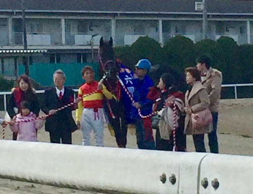 ★『六甲盃』は「カツゲキキトキト」がダントツ人気に応える圧勝劇!写真は現地で応援された方に、ご提供してもらいました。勝って当たり前、負けたら大ブーイング必至といプレッシャーの中、お疲れさまでした大畑雅章ジョッキー。前日の水曜の名古屋では、7番人気のJRA馬「クラウンビュレット」を勝利に導く他、1日で3勝をマークした佐藤友則ジョッキーでしたが、今日は兵庫の「キングブラーボ」(7番人気)に騎乗し9着でした。さて、東海以外では初重賞勝ちとなった「カツゲキキトキト」の今後は『名古屋大賞典』から『オグリキャップ記念』というローテーションと思われます。★名古屋けいば『スプリングカップシリーズ』は金曜が最終日!メインは『コーラルオープン』です。『六甲盃』を回避して、こちらに回ってきた「アサクサポイント」ですが、今回は内枠でモマれる不安も少々。まあそれくらいのハンデは克服してもらわないと困りますが、スピード上位の「サンデンバロン」が、スイスイと・・・「大黒社ネット予想」は、ここをクリック。