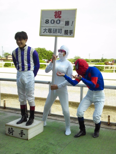 ★さて『笠松けいば・弥生シリーズ』(前半)が開幕します。ひとつのシリーズですが、前・後半に分かれて、2度の出走も可能なものです。初日からJRAの交流レースが2鞍もありますが、JRAの新人・川又賢治ジョッキー。(栗東・森秀行厩舎所属)が騎乗する第10レースの「ノリミ」は馬券圏内の一頭でしょう。また川又ジョッキーは、交流レース以外にも笠松馬4頭に騎乗。特に5レースの800メートル戦の「フェイマスアゲン」は、ポンとスタート決めれば、十分、チャンスはありそうです。話題にもなるのでぜひ、笠松で初勝利を決めてもらいたい気もします。かつてはデビュー直後の福永祐一ジョッキーも苦労していた魔の第1コーナーとか、トリッキーな笠松コースは、新人さんには試練となりそうですが、きっといい勉強にもなるハズです。★初日の水曜には『島崎和也騎手地方競馬通算300勝達成セレモニー』も予定されています。写真の大原浩司ジョッキーの勝負服を着て、スパイダーマンとしてセレモニーを盛り上げているのが島崎和也ジョッキーらしいのですが、詳細は当時の黒ゆりさんのブログに。今週の笠松本場での「大黒社」の場立ちの予想は、水曜と木曜の2日間営業します。(ネット予想の方もご利用下さい)★「大黒社ネット予想」は、ここをクリック。
