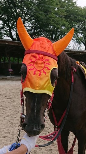 ★木村オーナーから「サニーゴット」の写真をいただきました。馬名の「サニーゴット」は、元SKE48メンバーで、みらいクール所属の矢神久美さんの神から「ゴッド」を、小野晴香さんの晴からは「サニー」を取って命名されたものなのですが、メンコのデザインも彼女達が考えたそうです。インパクトあるデザインですね。注目の新馬戦は13日・木曜の第5レースです。6頭立てです。今のところ(笑)『800メートル向きではなく、本格化は先。過度な期待は禁物ですよ』と尾島徹先生が超弱気だったと、木村オーナーが教えてくれました。確かに能試でも気の悪いところを見せていました。さて葵ちゃんがどう乗るか!まあ尾島先生とこは「サニーゴット」を含めて三頭出しですが、他の二頭が人気を集めそう。なお木村オーナーは、お仕事のために笠松には来られないそうです。★初日(水曜)の笠松けいばのメインは、JRA交流『ラベンダー特別』です。JRAの荻野極ジョッキーは、何と計8鞍にも騎乗します。荻野極ジョッキーと貸し服ファンの方には、たまらない1日に。砂の補充があったそうですので、外差しも決まりそうですが、梅雨時でもあり馬場状態の変化にはご注意ください。★笠松本場での「大黒社」の場立ちの予想は、水曜と木曜の2日間営業します。(ネット予想の方もご利用下さい)★笠松けいば開催中!ネットケイバさんでも予想をしております。 元祖「大黒社ネット予想」は、ここをクリック。