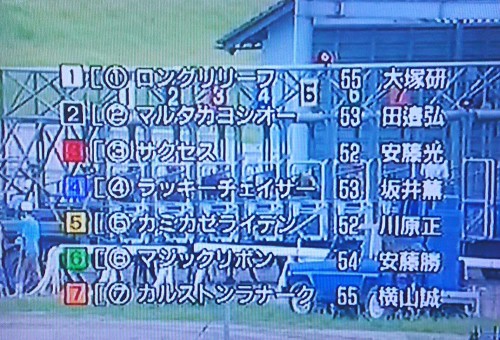 ★土曜・新潟9レースの馬連1点買いは失敗。新潟11レースは、狙い馬リストの「アポロノシンザン」が逃げ切り勝ち。単勝と馬連も本線で的中。そして小倉12レース、13番人気のリスト馬「ブライティアレディ」が3着に届いてくれて高配当を的中できました。さて日曜。推奨馬の二頭が不発の後、やっと『エルムステークス』を○「ロンドンタウン」◎「テイエムジンソク」馬連3点で的中。ここは賭け式の選択が上手くいった。しかし『関屋記念』が「ダノンリバティ」を軸に買うも1・2着馬がヌケに。複勝だけは押さえてあるも、もちろん取りガミにで、土曜日の儲け分を減らす結果に。月曜から場立ち5連戦なので、JRAのおさらいは簡単に終わらせてもらいます。★下の写真は「マジックリボン」(安藤勝己騎手・荒川友司厩舎)が勝った1999年の『くろゆり賞』※グリーンチャンネル・全国競馬便りより。逃げたのは大塚研二ジョッキーの「ロングリリーフ」楽な手応えで先頭に立ったアンカツさんは、後ろをガン見する余裕。ゴール前は流す余裕。2着「ラッキーチェイサー」3着「ロングリリーフ」「マジックリボン」は、この年の『全日本サラブレッドカップ』も、JRA馬を相手に優勝していますが(何と1番人気で)敵地での『TCK女王盃』『クイーン賞』『マリーンカップ』でも2着に好走。JRAデビューのお馬さんでしたが、荒川先生が開花させた忘れられない名牝でした。今年のくろゆり賞(15日)も、熱戦を期待!★今週の笠松本場での「大黒社」の場立ちの予想は 、最終日まで5日間とも営業する予定です。(追記)お盆シリーズも、笠松競馬場の開門時間は『10時30分』です。10時ジャストと思っているお客さんも少なくないと思います。暑い中、お待ちいただくことになるので、ご注意ください。まあ15日だけは、神田舞ちゃんと会うのもよし(^^)/(舞ちゃんは10時に、正門の専門紙売り場登場とか) ★笠松けいば開催中!netkeibaさんでも予想をしております。 元祖「大黒社ネット予想」は、ここをクリック。