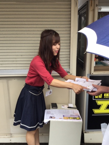 ★本日は『2017ヤングジョッキーズシリーズトライアルラウンド金沢』が行われました。第7レースでは、渡邊竜也ジョッキーが勝ち、加藤聡一が2着という東海勢のワンツー決着!二人とも、ほぼファイナルラウンドへの進出を決めたようです。詳細はこちら。金沢に行って、その東海ワンツー馬券もゲットしたという神田舞ちゃん。写真はお盆の15日、「競馬エース」の販売やパドック解説に登場した時のものです。(黒ゆりさん撮影)★名古屋けいば開催中!netkeibaさんでも予想をしております。 元祖「大黒社ネット予想」は、ここをクリック。