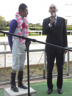 ★笠松グランプリシリーズが終了。予想の方は、トータルでも高い回収率をマークできました。※予想結果は、netkeibaさんのサイトで確認してもらえます。『笠松グランプリ』も本線で的中できましたが、熟女「プリンセスバリュー」が2着に届いていたら、もっと嬉しかったのですが。勝った「ラブバレット」は、ここを目標に万全の仕上げで3連覇を達成。ただレースのレベル的には「オヤコダカ」と叩き合った1年前の方が高かったですね。そんな中で「トウケイタイガー」は4着。確かに逃げ馬には不利な馬場状態でしたし、勝ち馬に直付けされる展開苦もありましたが、ベストの頃のデキにはなかった気はします。馬券的には、笠松グランプリや、その最終レースの「カンテラガール」で大儲けしたと思ったら、翌日の「イクミン」で溶かしたり・・・穴で狙った『浦和記念』の「グランディオーソ」が落馬してしまつたり、出入りの激しい今週でした。★金曜の笠松・第10レースを勝った名古屋の「クールレオ」で、内村寛司調教師が通算700勝を達成でした。内村寛司先生といえば、やはり「ゴールデンモンド」を思い出します。あの坂本敏美ジョッキーで1983年の『東海ゴールドカップ』も勝っているのですが、ある名古屋のジョッキーが、もう1周あるのにゴールと勘違いして(当時2500メートル戦)大騒動になった時の勝ち馬だったと記憶してます。他にも、大井の『スーパーダートダービー』(1997年)で、アワやの見せ場を作った「セイエイツートップ」(吉田稔ジョッキー)も忘れられません。内村先生、また思い出をください。★写真は、吉井友彦ジョッキーが800勝を決めた22日の『ワイエス・コーポレーション杯』での表彰式の様子。(おなじみの吉井ファンの方が撮影されました)解説はこちらに。吉井ジョッキーの『800勝達成記念セレモニー』は、12月29日に予定されています。えっ次開催じゃないのと思いましたが、多くのファンの方が集まる年末開催に行うことはタイムリーですね。★土曜の夜の『サウナイーグル競馬塾』の告知を。私が塾長を務め、日曜の重賞レースを主に検討するイベントですが、ご参加の方々には「無料招待券」や「食事券」などをゲットできる特典も用意されています。『サウナイーグル』(男性専用)さんをご利用の方は、ご自由に参加いただけます。競馬初心者の方もベテランの方も、お気軽にお越しください!土曜夜の9時30分からです。(年内は11月25日と12月2日・23日に開催予定です)「サウナイーグル」最寄の「名鉄知立駅」から「中京競馬場前」までは電車で10分弱という近さです。また今年も『サウナイーグル』さん主催、『チャンピオンズカップ観戦ツアー』を開催します。よろしくお願いします。では、お休みの方もお仕事の方も、週末のご幸運をお祈りしております。★JRA版「大黒社ネット予想」は、ここをクリック。25日の土曜分の中央版「大黒社ネット予想」は、すでに配信しておりますが、26日の日曜分の予想は、土曜の深夜2時頃に配信いたします。※配信情報はツイッター @daikokusya でもお知らせしています。
