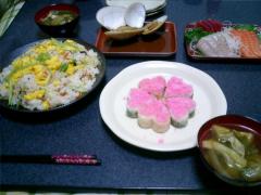今日はハルの初節句ちょうど旦那さんがお休みだったので、旦那さんにユウとハルをお願いして、昼過ぎから近くのスーパーを自転車ではしごして、必要な食材の買出し。帰ってきたその足で早速準備に取りかかりました。レシピを度々見て作る、初めてのメニューにちょっと悪戦苦闘時間がかかりましたが何とか作ることができました。そんなハルの初節句のメニューはこんな感じ 時間はかかったけど、出来上がりはかなり満足できるものになりました。ハルに「おめでとう」と言って、私たちだけが食べたんですけどねでも、ユウくんもすっごい喜んで食べてくれたからよかった。その後、ハルとお雛さまとの記念撮影をして、ハルの初節句のお祝いは終了~。ちょっとおめかししたハルとお雛さま 来年は一緒にご飯も食べようね、ハルさぁ、今度はユウくんの端午の節句だぁ