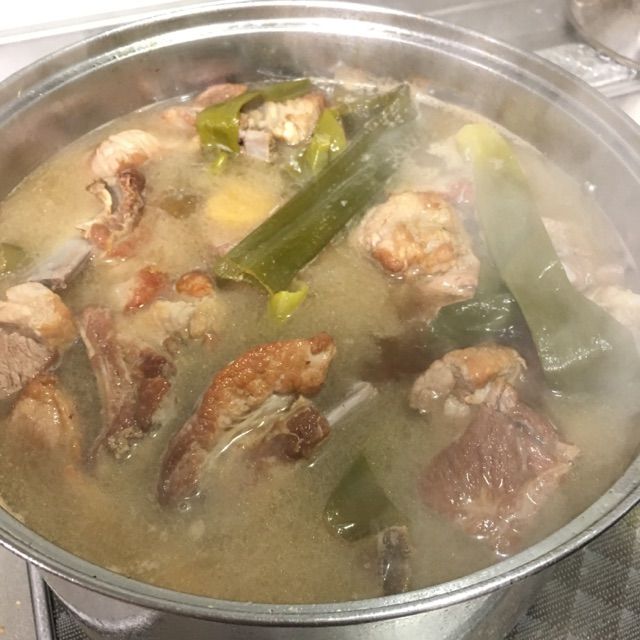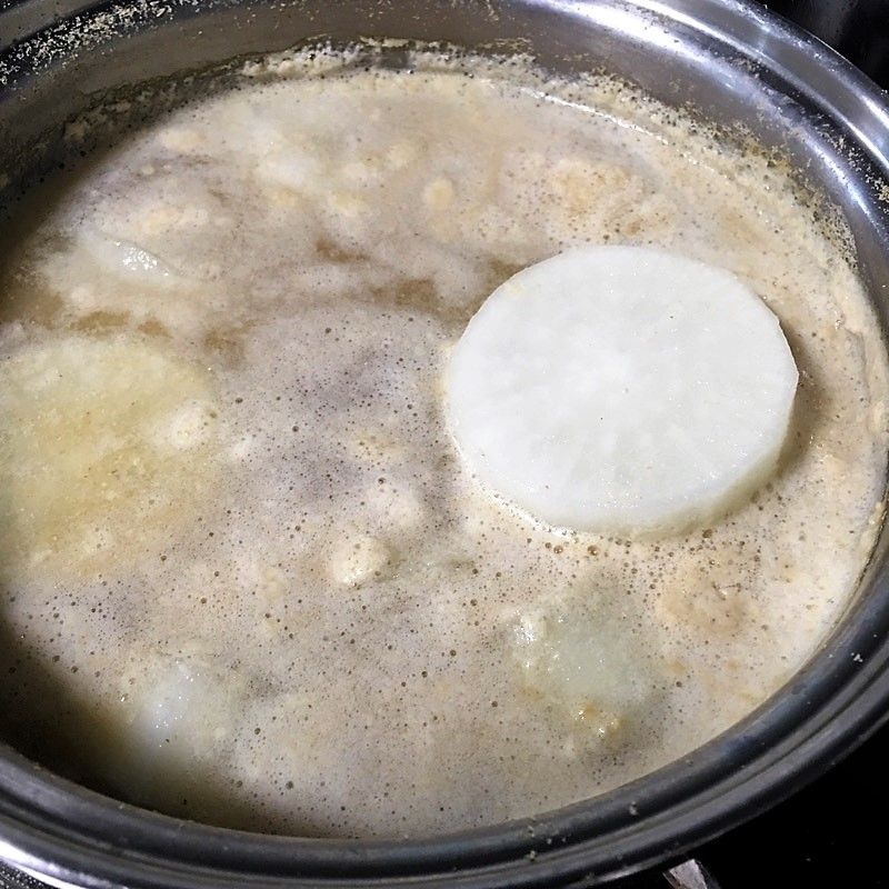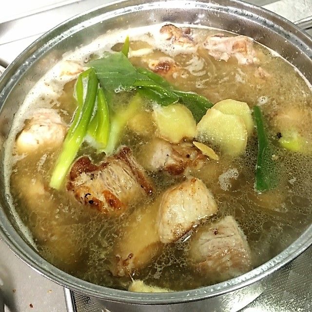 鍋に水をひたひたに入れて 『酒』『生姜』 『長ねぎの葉っぱ』 を入れて30分煮る |