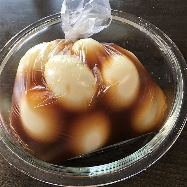『ゆで玉子』は 一緒に煮汁で煮ると 黄身が固くなるので ビニール袋に入れて 煮汁に漬けておく |