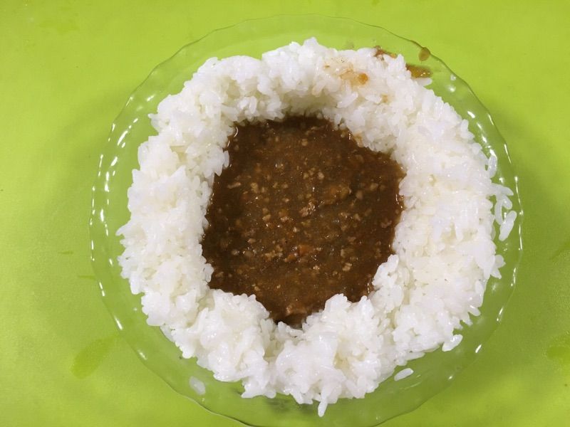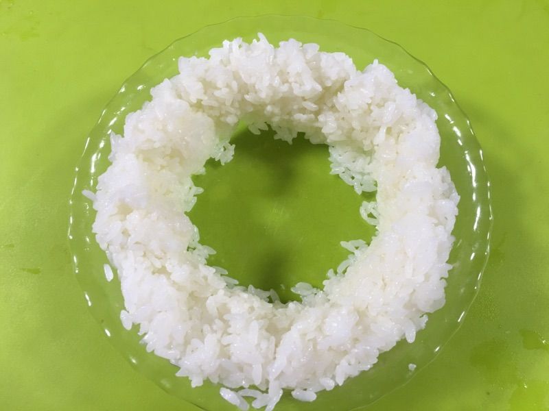 耐熱皿にご飯を ←こんな感じに ドーナツ状に入れる |