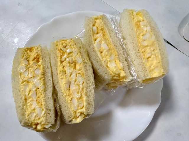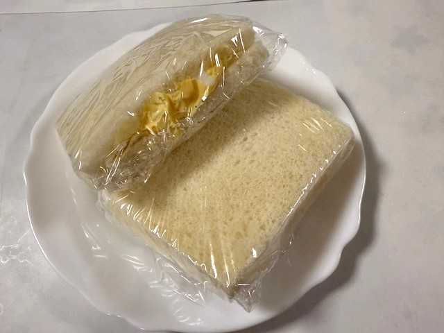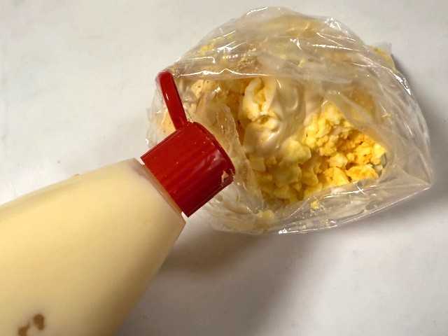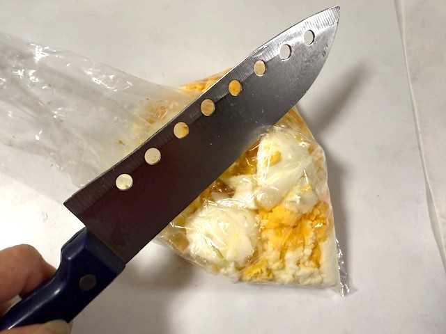 「玉子サラダ」のビニール袋の角をちょっと切って