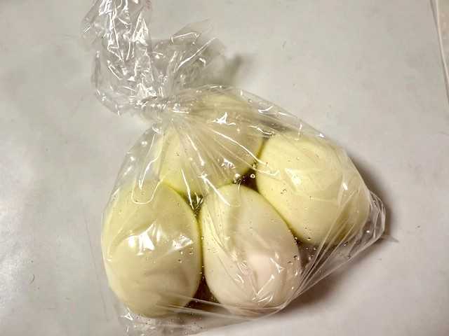ビニール袋に「ゆで卵」を入れて包丁の後ろでカットして