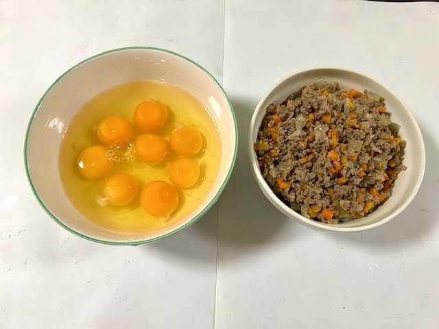 「玉子」&「ひき肉&玉ねぎ&にんじん炒め」を混ぜて