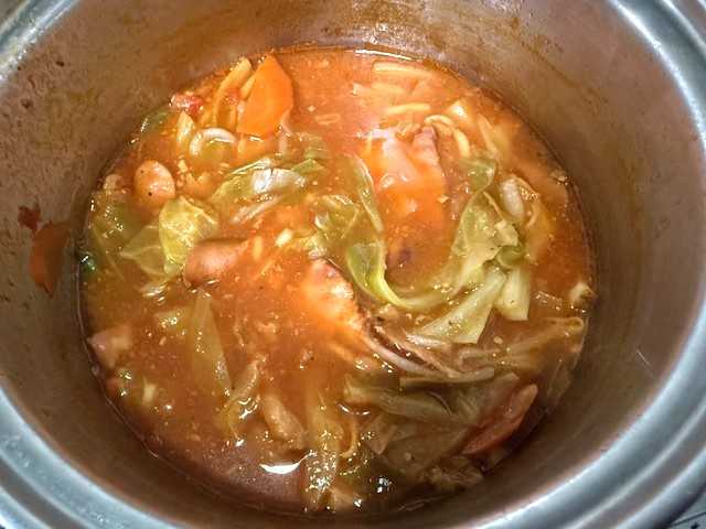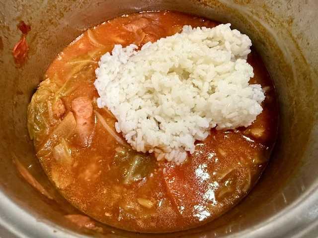 「キャベツ&ウインナースープ」に「ごはん」を入れて煮て