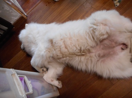 中々安定しない天気でしたが今日は朝から良好です。お店に娘達をあずけて一旦家に。娘達が居ない間に何時もより少し念入に掃除!!一休みしていると・・・携帯に雨アラームが!そんな~~ 頼むからもっておくれ~~!!・・・夕方、おわりましたよ~の電話。雨無く何とかセーフおぉ~~綺麗!美人さんだね~~だけど何時も事ながら家に着けば・・・。この通り、グ~タリ・疲れたね~。サンの寝顔・トイレを枕だけど、可愛い寝顔だな~暫らくして御飯の支度!何時もなら、トリミング後も支度中に台所に来るんだけど今日はよほど疲れたのかな??しかし、出来上がりはわかるようで。足元で催促!!そうだよね~、お腹満たさないとねれないよね~~今日も何事も無く無事終了!天候が今一安定しないけど、それなりに楽しもうな!!