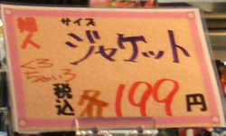 この前、ふと店の前を通ると、こんな値札がささっていました。ジャケット税込199円!?大丈夫なのか・・・?使い捨てジャケットなのか・・・!?儲けはあるのか・・・!?世の中安いものは探せばあるんだなぁ。。と思いながら横を見ると・・・。ロングコートも199円!?なんかこの店、間違えてるよ・・・。ひょっとして、円じゃなくてドル??
