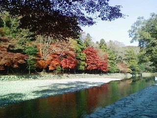 運よく紅葉の最盛期で、五十鈴川の川面に紅葉紅葉モミジの赤が映り込み素晴らしい風景を作り出しています。