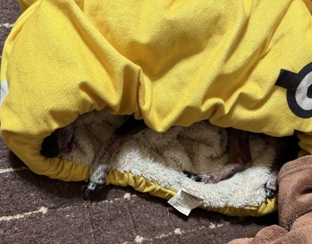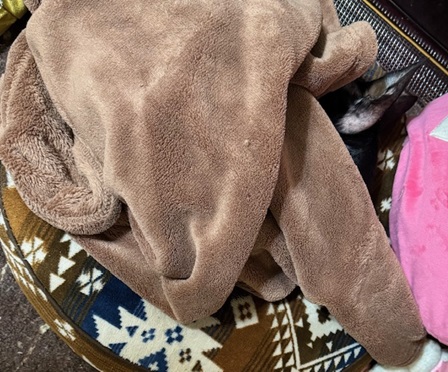 毛布掛けて、おとなしく寝ているマース耳だけみえていますね。