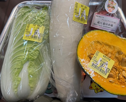 ミニ白菜56円、葉付き大根167円、紅くるり大根46円、かぼちゃ半分187円など~