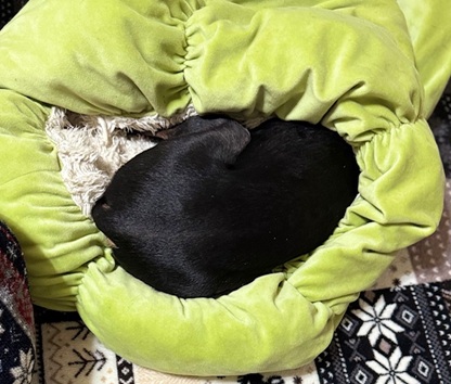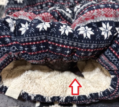入口付近で丸くなって、背中を出して寝ているマース