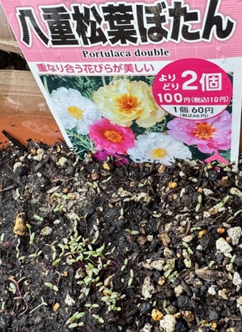 ダイソーの種、八重松葉ぼたん~鼻息で飛びそうな種でした。
