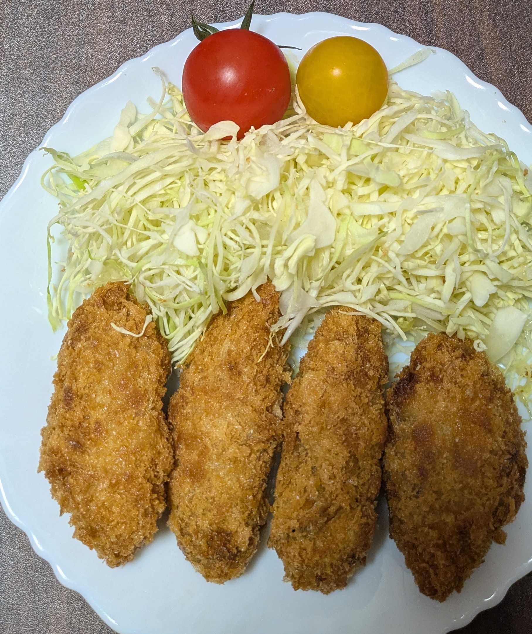男料理(夕食)カキフライ 彩りにキャベツとミニトマトを添えました男料理(夕…