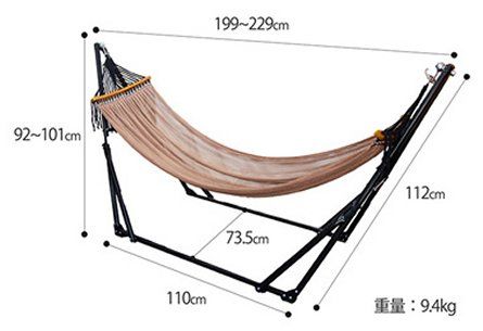 ハンモックに興味がありましたが、我家には取り付ける場所がありません。ネットで見つけた自立式ハンモック、これならどこにでも置けそうなので購入。もちろん、ネットであちこち調べ、見つけたのが耐荷重350kg・価格は5980円です。http://list.qoo10.jp/g/521960573到着後早速組み立てて使ってみました。快適で、少し揺らぐ動きが眠りを誘います。一週間ほど使って不具合が発生。購入先とメールでやり取りをし交換してもらいました。布部がネット状になっていて、再度の不具合防止の為、普通のハンモックを追加購入。耐荷重120kg・979円で、なんと自立式ハンモックの掛ける位置とぴったりでした。二重にして使っています。http://item.rakuten.co.jp/mthappy/0003-060/?s-id=shop_header_reco現在は、昼間少し眠くなった時に、「ちょっと寝てくるわ」と30分ほど昼寝に使っています。もちろん、ゆらゆらと快適に使っています。