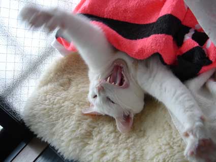 今日のポンポンは普通じゃなかった。私がレッスンから帰ってきたら、妙に機嫌が悪い。ほんとにずーーーっと鳴きっぱなし。っていうか、文句を言っている。リラックスさせるためにブラッシングをしてあげたら、毛がごそっと抜けた。しかも静電気がバチバチ飛んでる。それを見て、あ、こりゃ、地震でも来るのかなと思った。一応、気をつけたほうがいいと両親に電話をしておいた。(ウチの親は半信半疑)そして、数時間後。大きくないけど、ほんとうに地震がきた。しかも3回くらいに分けてあったみたい。。。よくやったね、ポンポン。ああ、疲れた~。ボク地震きらいだー。
