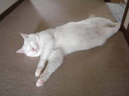 きのう夫と映画を見た。Will Smithのi robot。私も夫もSF好きで、この作品は小説ですでに読んでいたが、「あれ、こんなストーリーだっけ?」みたいな感じの映画だった。でも趣旨は小説と一緒だったので、よしとしよう。感情のあるロボットsonnyには参った。私、こういうのは引き込まれちゃって映画が終わった後にもずっと考え込んでしまい、夢にも出てくる。で、夜中にロボットの夢を見て飛び起きた。その一瞬後、ポンポンが耳をピクピクさせて起きて、何かをじっと見てる。そしてまもなく、地震が来た。千葉は震度4だったそうだ。けっこう大きかった。ああびっくりした。