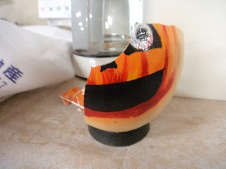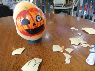 先日お客さんに割られたハロウィンエッグアート。強力な接着剤を買ってきて割れた殻をくっつけてみました☆意外とちゃんとくっつくのがびっくり^^;(爆