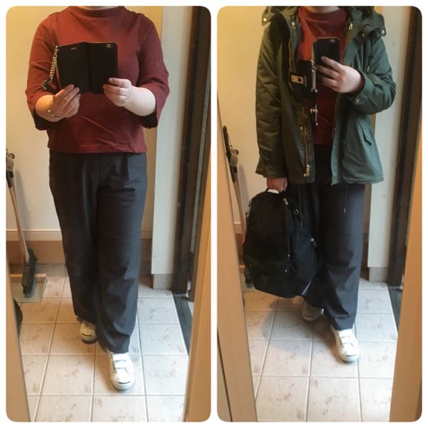 こんばんは、Odeboo☆です! 生暖かい朝でした。 カットソーにしようと思ったら、 微妙〜なコーデになってしまった!! コート:グリーンレーベルリラクシング(42) カットソー:UNIQLO(XL) パンツ:UNIQLO(XL) バッグ:マリメッコ 靴:コンバース レンガ色とカーキに私の身体が合わさると、 もさっと感が増し増しになる〜。 なんかオジさん臭が出てるわ…。 クローゼット開けるまでは、 ネイビーのアウターにしようと思ってたのに!! 全く気分が乗らないので、 今日はこの辺で。 応援してくださいランキングに参加しています。愛のクリックを頂けると励みになります にほんブログ村 大きいサイズランキング