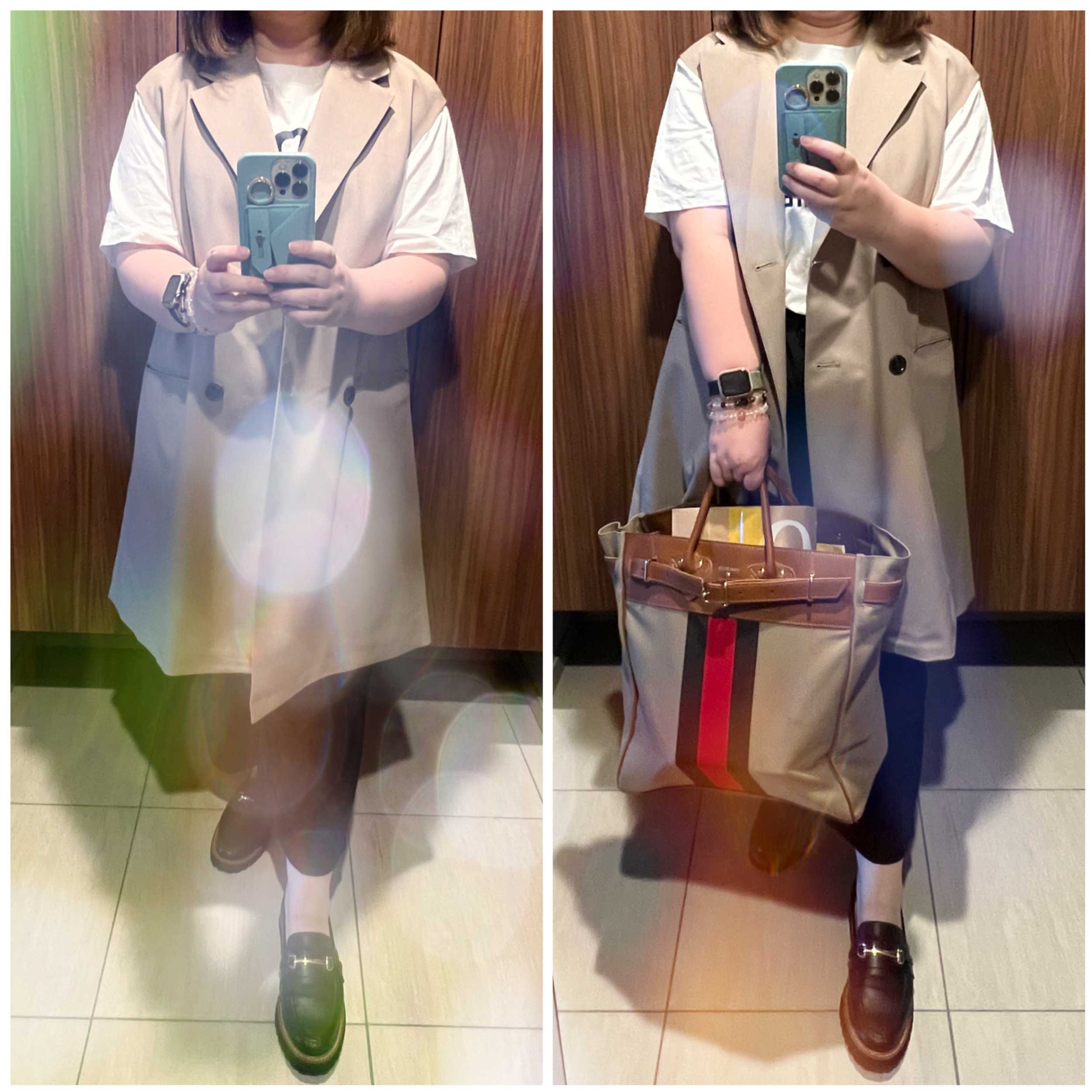 こんばんは、Kacoです!(はじめましての方はコチラ☆も見てね)明日は休暇を取ったので、今週は今日で終わり〜。・・・で、今日の格好。ニット:Spick & Spanパンツ:Uniqloバッグ:Stella McCartney靴:Barnyardstorm今季買ったメッシュニット外だと若干暑いんだけど、エアコンの効いた部屋だとちょうど良い。バッグはいつものステラのトート暑かったけど、ローファーにしました。ユニクロのワイドタックパンツが結構かっちりしているので、靴もかっちり目に。さて、先月息子さんの買い物に付き合ってGUに行ったら、気になるものを見つけたのよ。何点か見つけたうちの2つがどうしても忘れられなくて買っちゃった!このジレがおすすめ〜ジレ何枚持ってるんだ?ってツッコミは置いておいてねwww膝丈でかなりオーバーサイズ。なので、1つか2つサイズを下げて購入するのが良いと思う。ベージュを買ったよん。楽天で定価で買ったこのジレ。暑くてまだ着てないんだけど、その間に値下がりしたよ・・・。この時は短い丈が欲しかったんだと思う。でも、私の体には膝丈がバランス取りやすいわ。もう1点はこちらのシアーニット。BBAが着ても安心なシアー感ですぞ。Uniqloのメッシュニットが良かったので、色違いを買おうかなーとも思ったんだけど、メッシュニットよりも長い期間着られそうなので、こちらにしました。楽天だと、こんなのがあるよーGUのより、薄手のものが多いけどね。にほんブログ村大きいサイズランキング