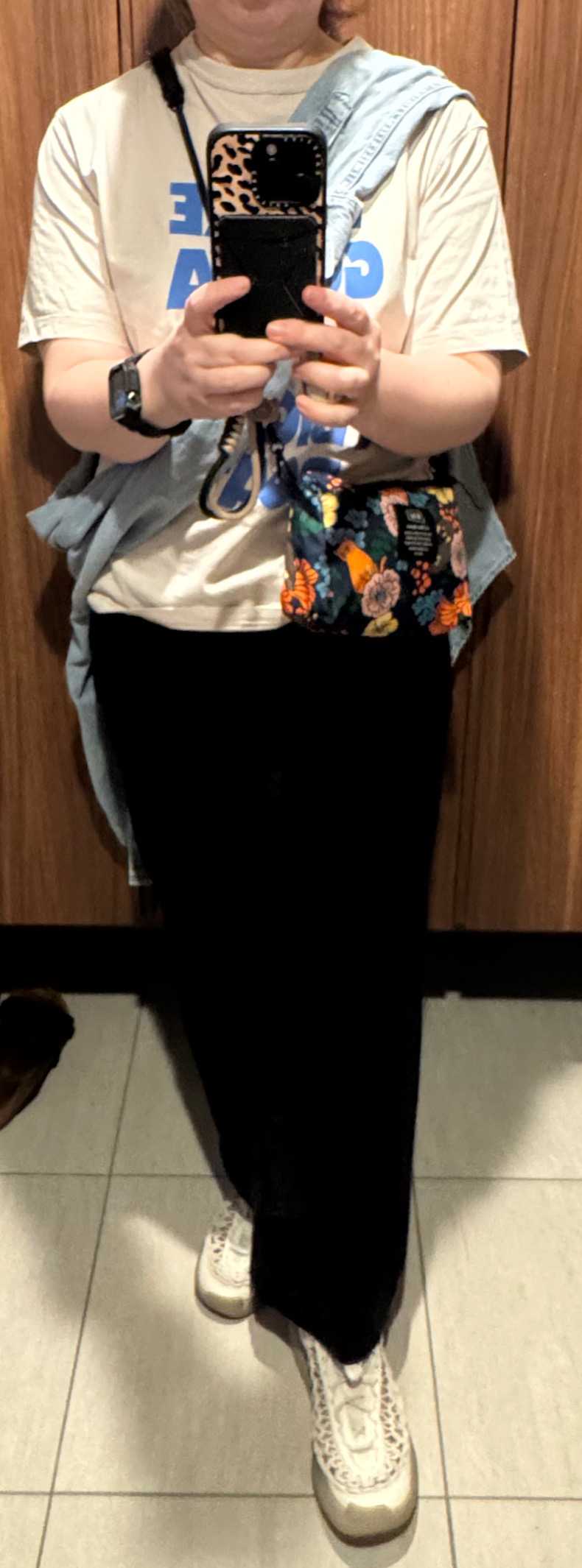 今日は会社を早退して、推しのライブ会場へ。チケットは・・・ない。大阪は当たらなかったので、来週、横浜で参戦します。買うのを迷ってオンラインで買わなかったツアーTが欲しくなっちゃって、それを買いに行ってきましたよ。絶対に暑いので、少しでも涼しい恰好にしてみました。ブラウス:SHIPS anyキャミ:Uniqlo:Cパンツ:GUバッグ:LeSportsac靴:KEENコットン100%のゆるっとしたバブラウスに、エアリズムのブラトップが一番涼しいと思ってる。先週買ったこのブラウスはサイドにベンチレーション(?)があるので、風が入ってくる氣がしてます。ブラトップはストラップが女性らしくて氣に入ってます。白も買えば良かった・・・ボトムスは迷ったー。先週はグレーのワイドパンツに合わせたら、とてもシックな感じで良かったんだけど、今日は歩くのでスニーカーに合うように、デニムにしてみたよ。(丈がちょっと短いんだけどね💦)バッグは軽さメインでレスポ画像にはないけど、買ったものを入れる用にマリメッコのトートにしました。足元は歩けるようにKEEN本日の推し🩵写真もいろいろと撮りたかったから、うちわとかペンラとか持っていこうか迷ったんだけど、会社で見つかるとうるさいので諦めました。めちゃめちゃ暑かったけど、行って良かったわー。書い忘れたTEEもゲット。TEEだけのはずが、ステッカーも買っちゃった!本日の氣になるもの~涼しげなブラウス特集アメブロで期間限定のダイエットブログを公開中バナーをクリックしてみてね<新しいサイトを作りました!>アラフィフ向けのお話をしています。バナーから遊びに来てね👋にほんブログ村大きいサイズランキング