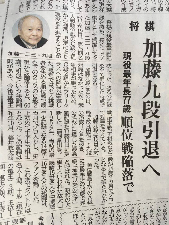 現役最年長の棋士加藤一二三氏が引退する事になりました。降級点が通算で3つ重なると、フリークラスへと降格することになりますが、降格によるフリークラス入りは60歳までという年齢制限が設けられているため加藤九段は引退する事になりました。私も子供の頃に祖父と将棋をやっていました。その影響で将棋番組も見るようになり加藤一二三の名前も知っていました。加藤九段の影響で棒銀戦法を覚えました。棒銀一筋で棋士のトップであるA級に36年在籍し名人位を取りました。神武以来の天才である加藤九段が残した功績は素晴らしいと思います。お疲れ様でした。