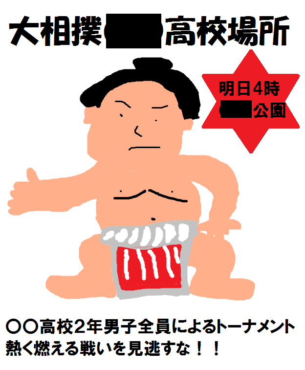 どうも、こいぬです。ぽんちゃんの部屋から面白い物を見つけました。(ぽんちゃんがブログ用にペイントで作ったもの)ぽんちゃんが企画した大相撲〇〇高校場所。ぽんちゃんは高校2年時に2年の男子全員を集めて相撲トーナメントをする事を企画したのです。校内でやろうとしたのですが、以前に全校ボクシング大会をやって先生にこっぴどく叱られたため校内ではできない状態でした。ぽんちゃんは学校の近くにある公園で行う事にしたのです。相撲大会前日にぽんちゃんはあちこちにチラシを貼ったりしました。僕もぽんちゃんから頂きました(笑)。観客集めに必死でしたがこのチラシが問題となったそうです。初代さんは相撲大会当日の出勤途中でポスターを見て大激怒!!「ぽんめ、テストも近いのに全く勉強もしないでこんな物作って恥ずかしいと思わんがか!」ぽんちゃんはそんな事も知らずに相撲大会でワクワクしていました。先生はこのポスターを見て放課後に公園周辺をパトロールする事になったそうです。そして2年の男子全員公園につくとお前らー!!こんな所で相撲する暇があったら勉強せんかー!!先生が待ち構えていたそうです。結局、相撲大会は中止になり強制帰宅させられてしまったぽんちゃん。相撲大会は幻になってしまいました。ぽんちゃんから預かった珍事件でした。