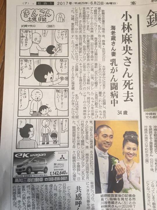 「人生で一番泣いた日」今朝の海老蔵さんのブログの内容が心配でした。今日の午後に悲報が入って驚きでした。市川海老蔵さんの妻でフリーキャスターの小林麻央さんが昨夜亡くなりました。まだ34歳という若さでした。昨年の6月に乳がんで闘病中である事を夫の海老蔵さんが公表し、その後は自らブログを開設し闘病生活や普段の生活の様子をアップし大きな反響を呼びました。今年1月にはがん公表後初めてTVのインタビューにも応じましたがその後体調が悪化し昨日の夜に亡くなったそうです。まだ幼い子供の事を思うと切ない気持ちになります。麻央さんは何よりも長男の歌舞伎デビューが見たかった事でしょう。麻央さんは良い妻だったと思います。愛人と隠し子作ったり記者会見キャンセルして飲みに出かけたりと素行に問題がある夫をどんな事があっても支えた妻の存在は大きいと思います。麻央さんが乳がんになった時、海老蔵さんも今までしてきた自分の悪行を反省し、今度は夫として自分が支える番になるという気持ちになったんでしょう。麻央さんのブログからは麻央さんの前向きな気持ちが見えました。家族とのやり取りを見ると理想の家族像というのが見えてきました。息子の歌舞伎デビューを見たかった事もあり懸命に病気と闘い絶対に10年後も生きるという思いがあったと思います。その夢は残念ながら叶う事はできませんでした。海老蔵さんも悲しみをこらえて今日の舞台に臨んだ事でしょう。小林麻央さんのご冥福をお祈りします。